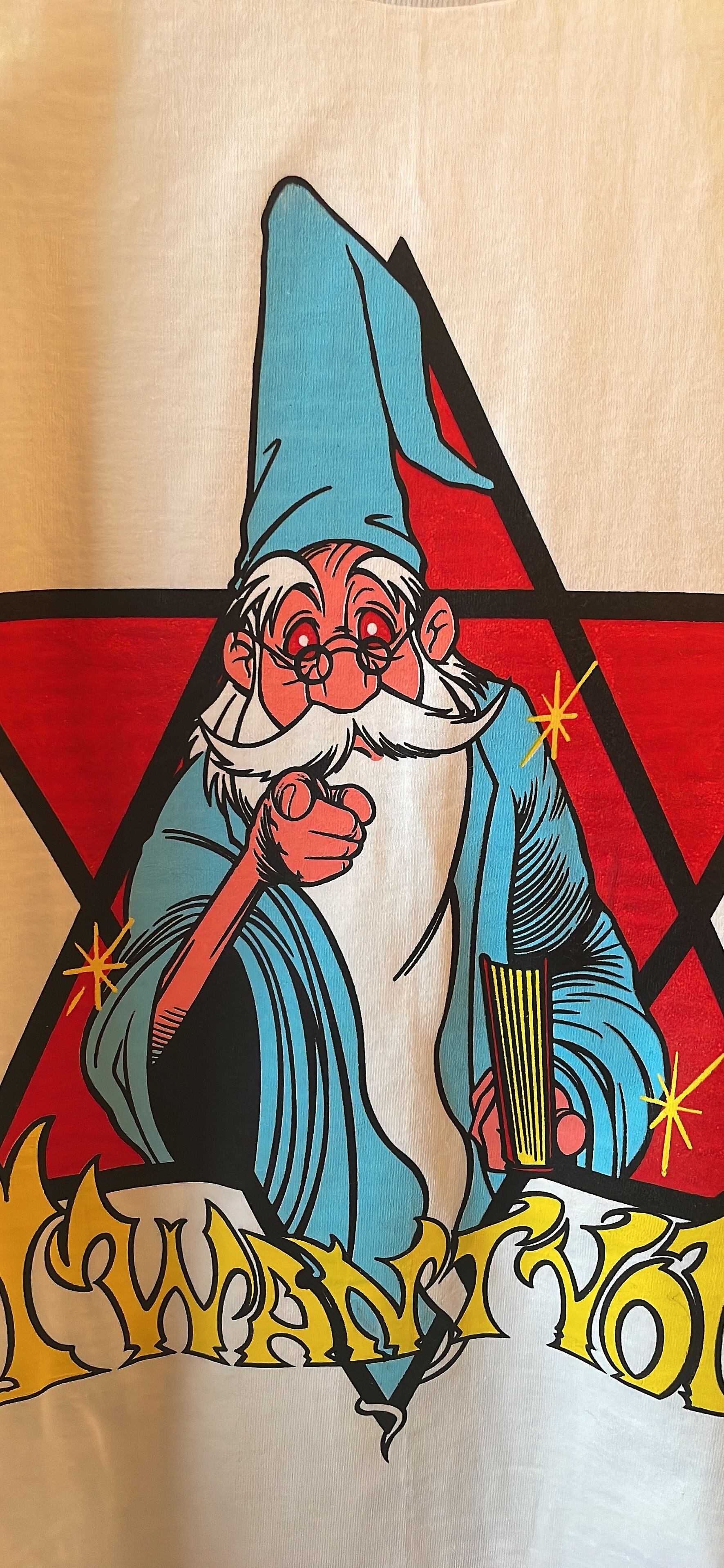 黒を刷ってそれをガイドにし、赤を重ね、水色を重ね、文字に重なってしまう水色を筆を使って黄色を上から塗り重ね、乾かした後に上から黄色の版を刷り、最後にハミ出した箇所をフォローするために上からもう一度ドンピシャ手合わせで黒を刷ります。